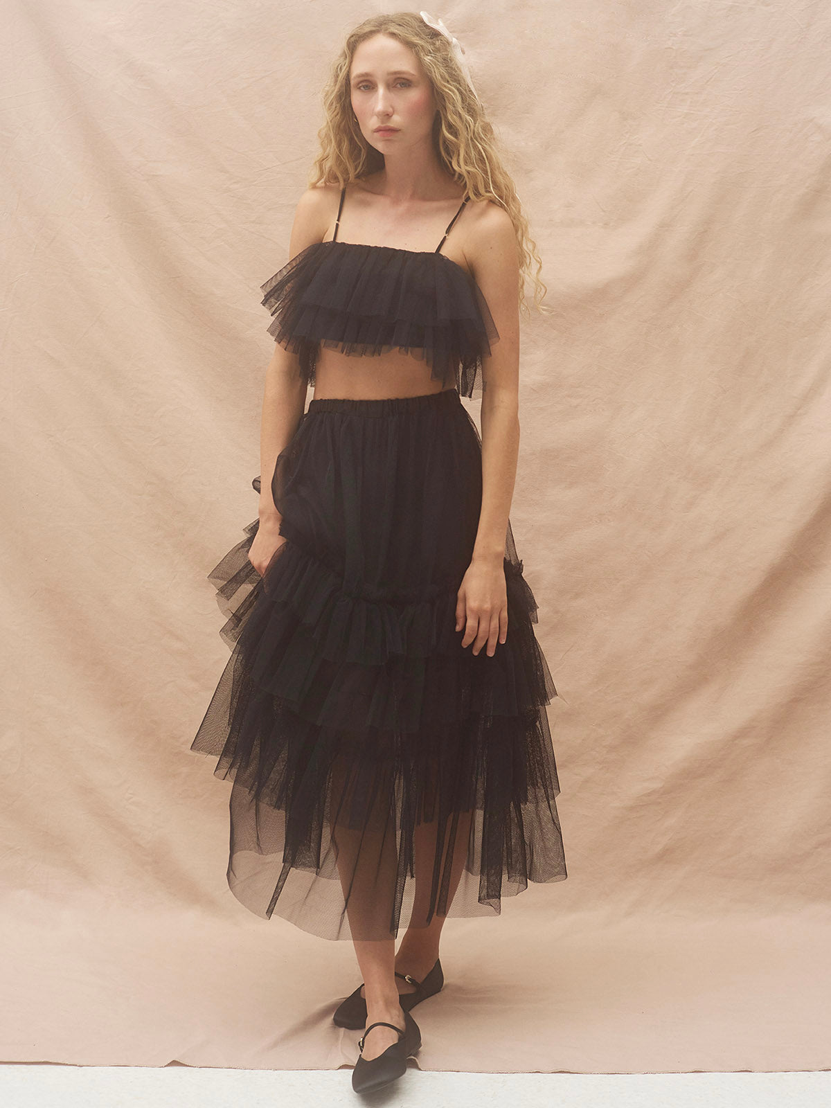 Gathered layers of tulle placed hammered silk elastic back for an easy fit.